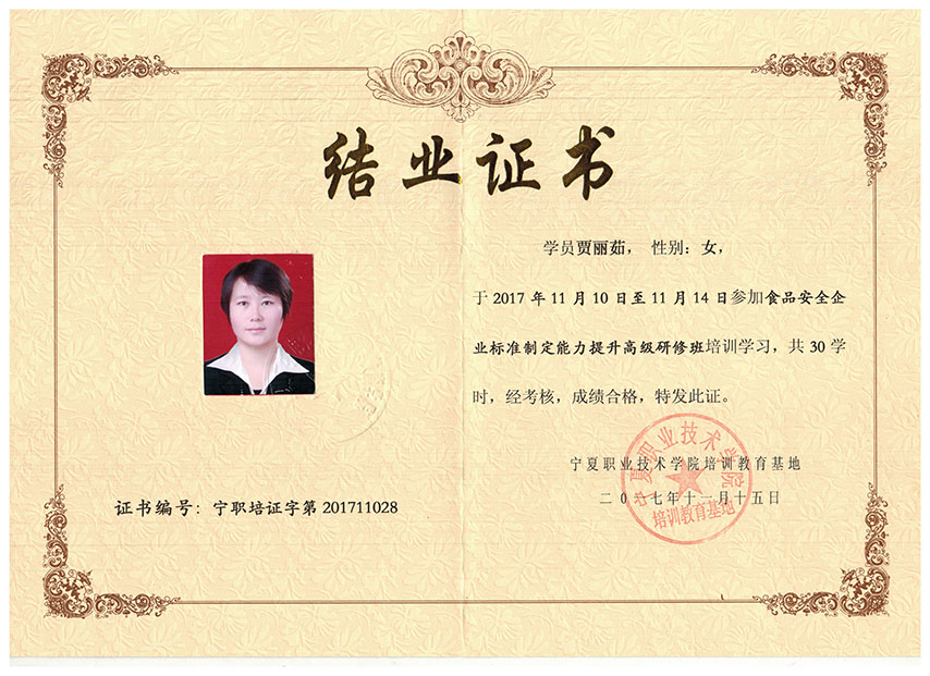 賈麗茹同志食品安全企業(yè)標(biāo)準(zhǔn)制定能力提升高級(jí)研修班結(jié)業(yè)證書(shū)