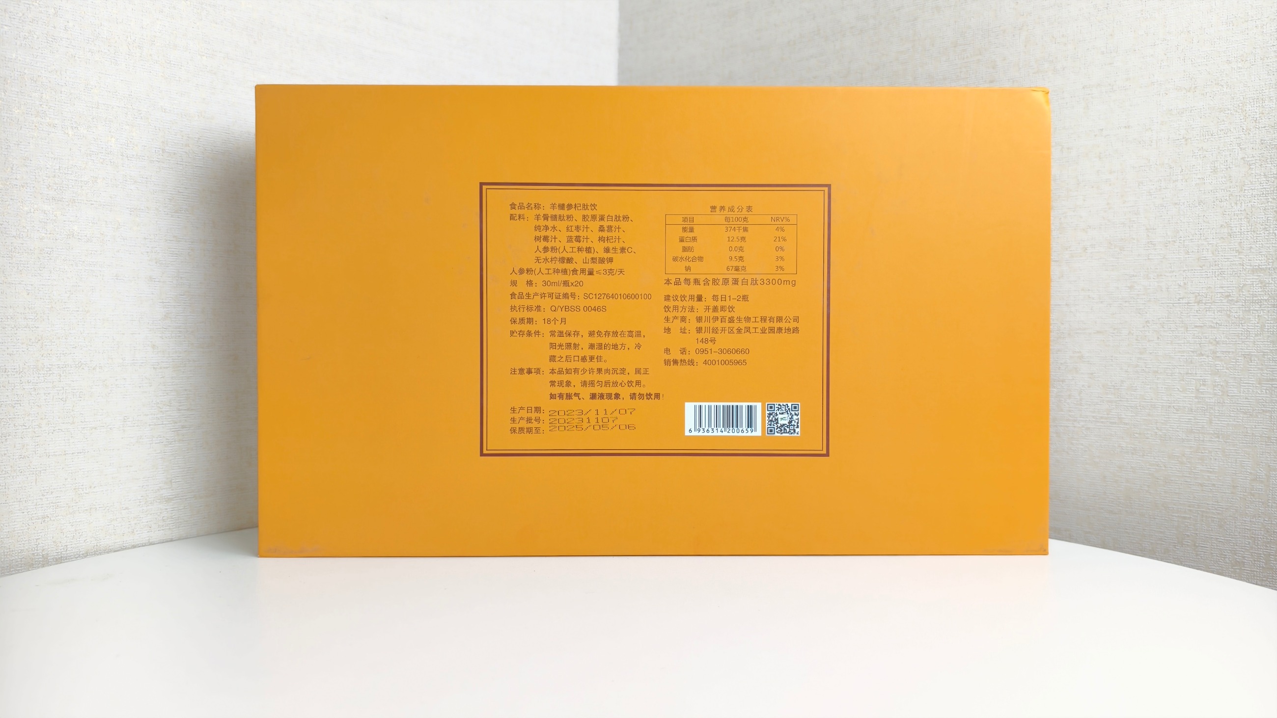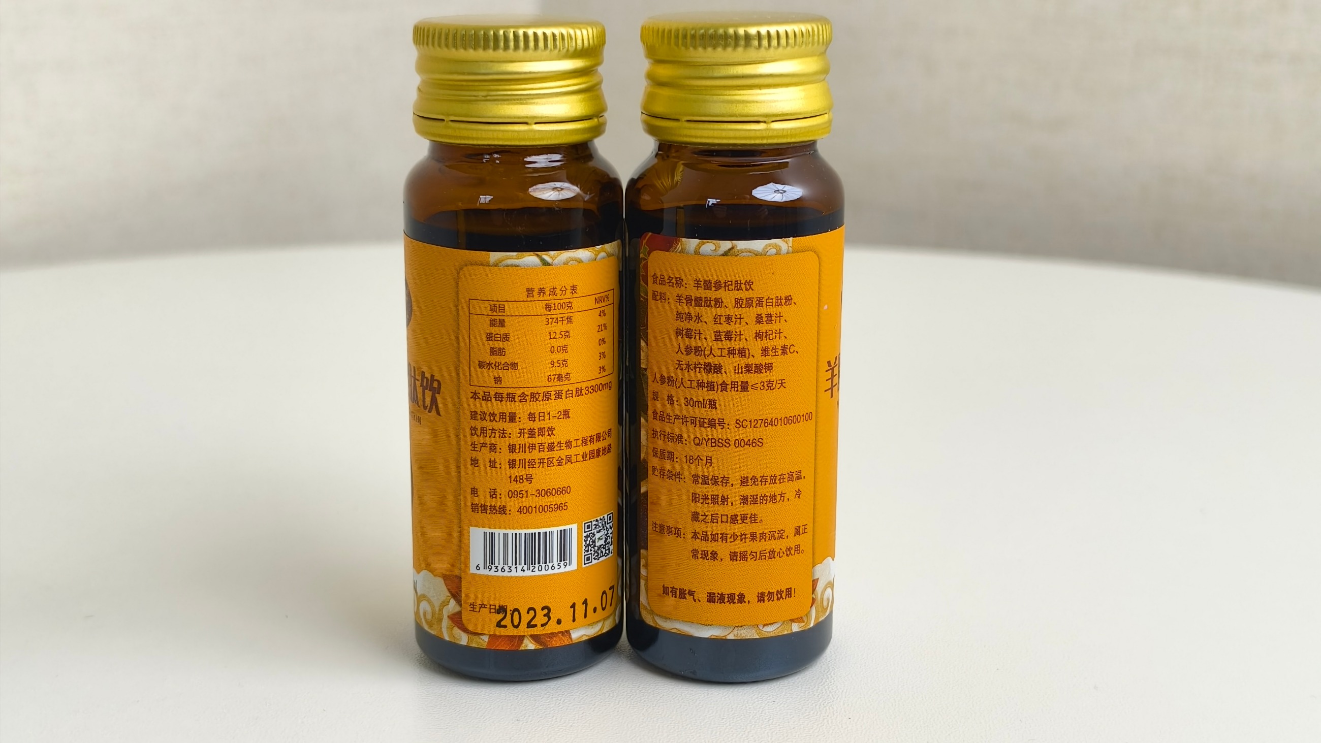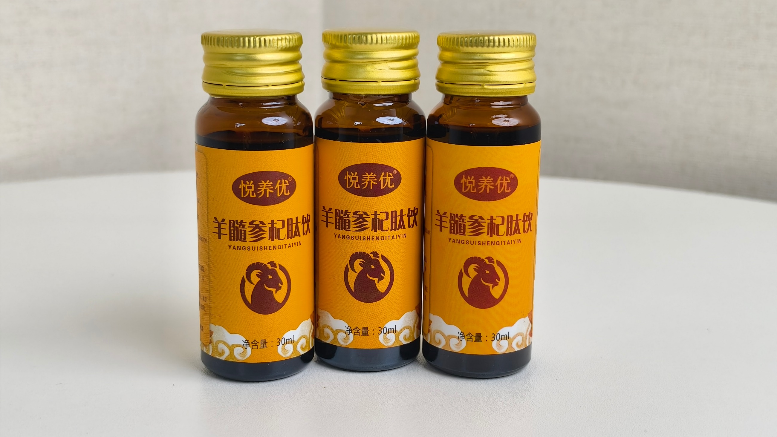 配料: 羊骨髓肽粉、膠原蛋白肽粉、純凈水、紅棗汁、桑甚汁、樹莓汁、藍(lán)莓汁、枸杞汁、人參粉(人工種植)、維生素C、無水檸檬酸、山梨酸鉀