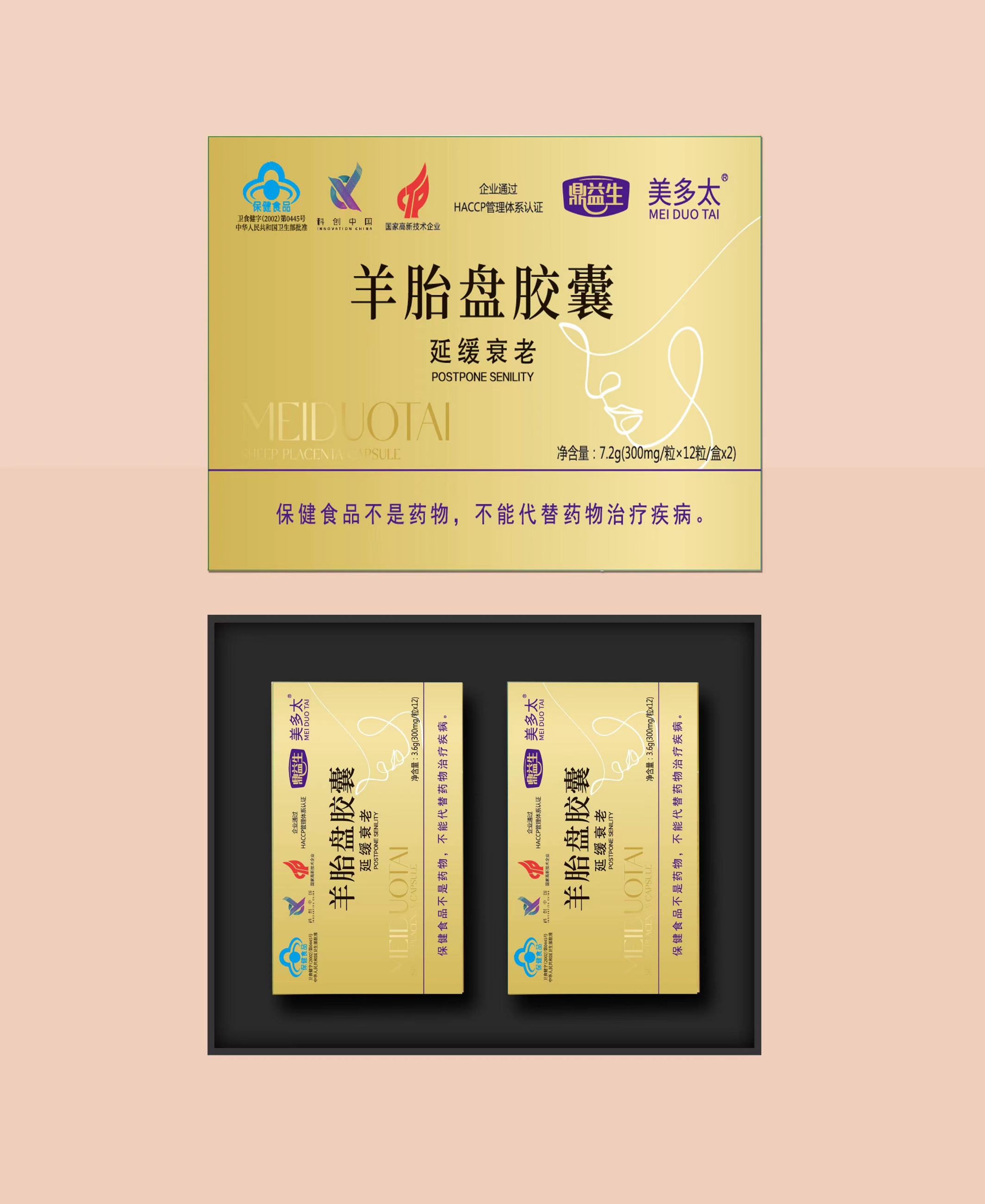 本品是以羊胎盤(pán)、淫羊藿、菊花、紅花為主要原料制成的保健食品,經(jīng)功能試驗(yàn)證明,具有延緩衰老的保健功能。